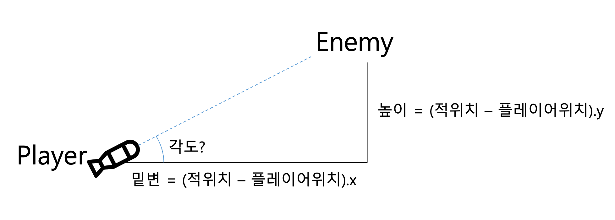 먼저 적의 위치에서(위치 정보는 2D 공간의 백터 입니다.) 미사일의 위치(플레이어의 위치라고 하겠습니다.)를 빼면 플레이어의 위치와 적의 위치로 직각 삼각형을 그리고 밑변과 높이값을 알 수 있습니다.
